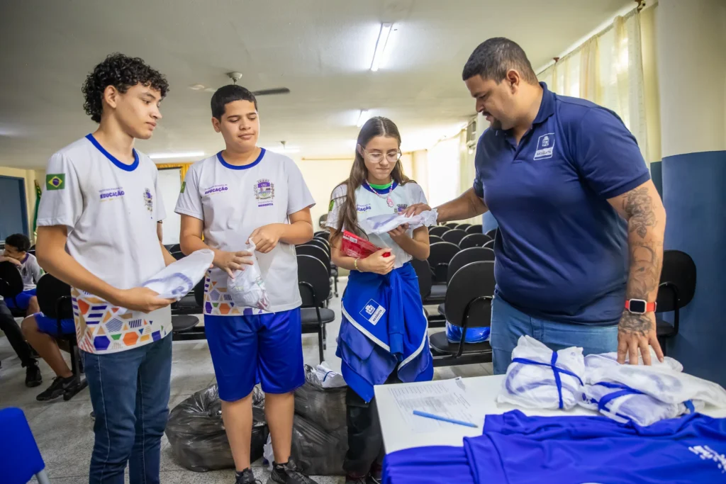 Na Escola Municipal Rotariano Arthur Silva, a entrega ocorreu nos dias 7 e 8, beneficiando cerca de 600 estudantes da EJA e do 6º ao 9º ano. Cada aluno recebeu um kit com cinco peças: camisa de manga, regata, short, calça e casaco, adequadas para diferentes situações do dia a dia escolar.