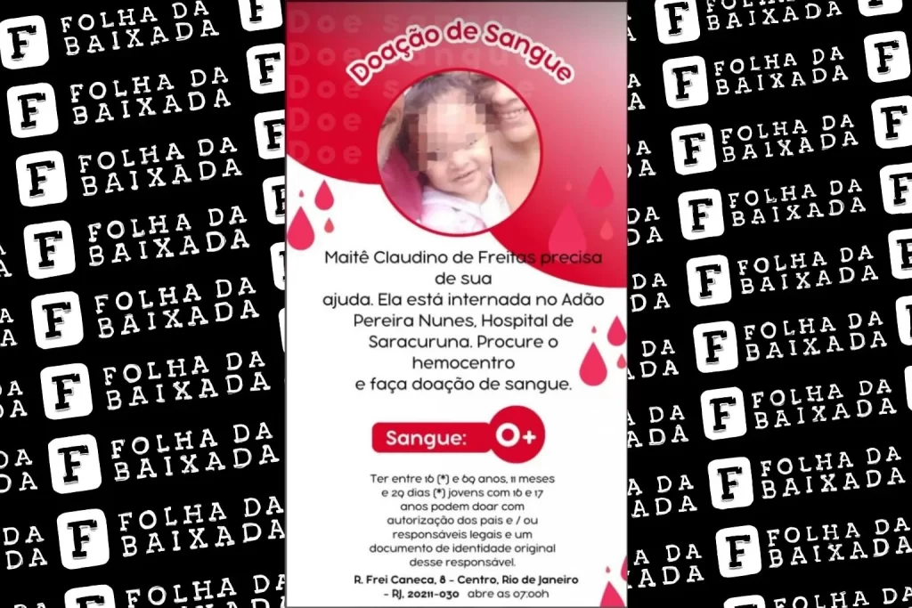 Familiares de Maitê Claudino de Freitas, uma criança de três anos, estão fazendo um apelo por doações de sangue do tipo O positivo, já que ela enfrentará uma nova cirurgia, ainda mais delicada, devido aos ferimentos causados por um tiroteio entre milicianos no Centro de Seropédica, na Baixada Fluminense, na segunda-feira (8).