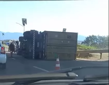 Tombamento de carreta com contêiner de 30 toneladas causa retenção em Duque de Caxias